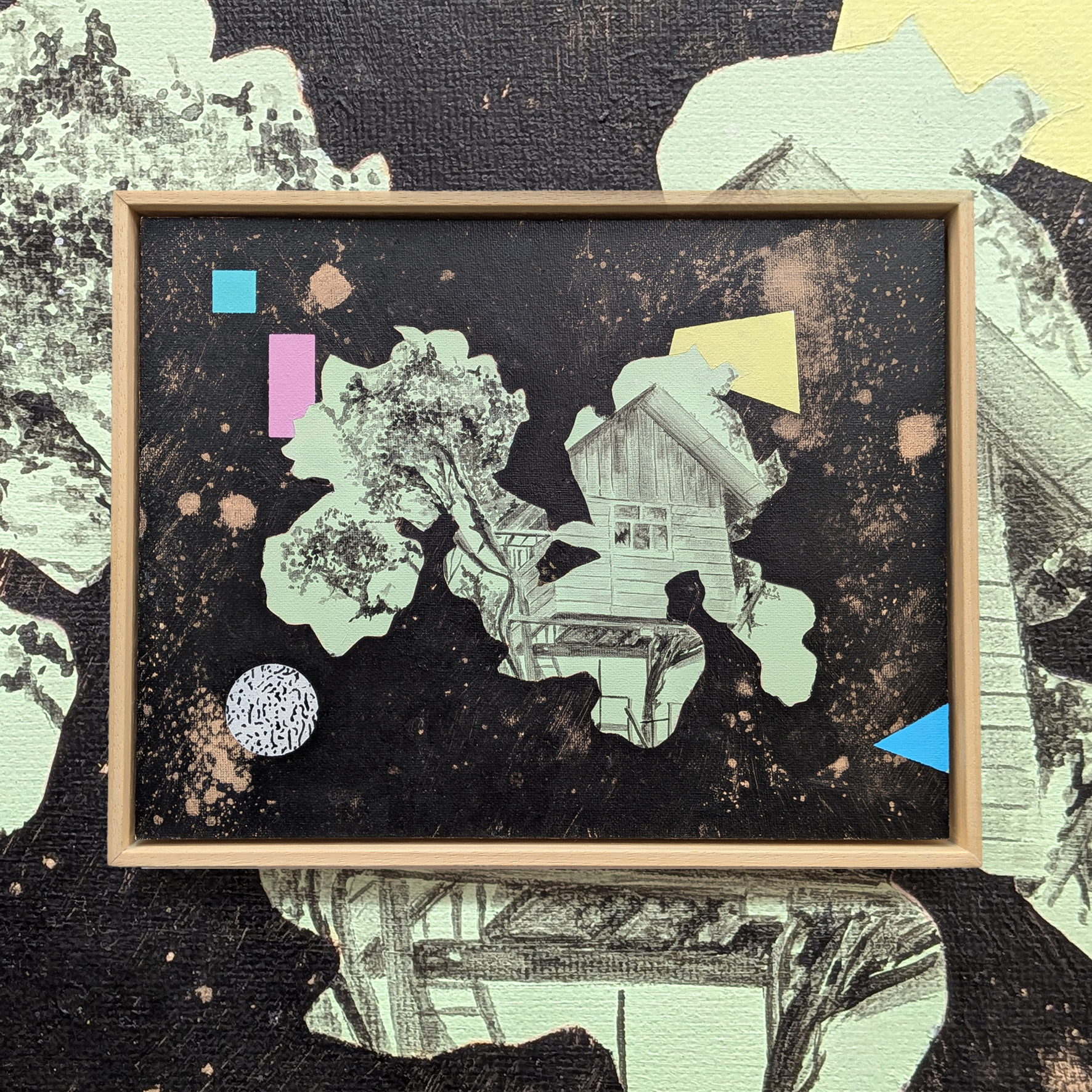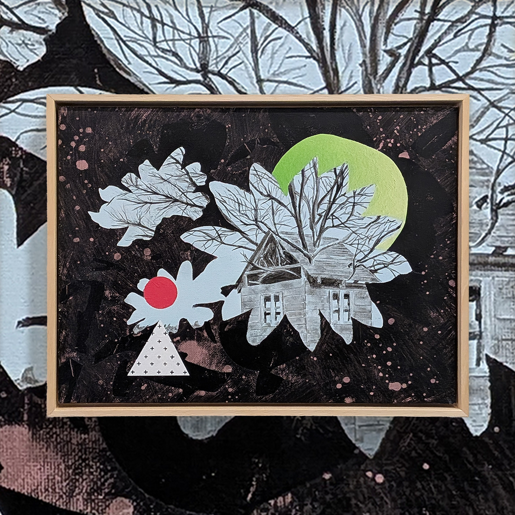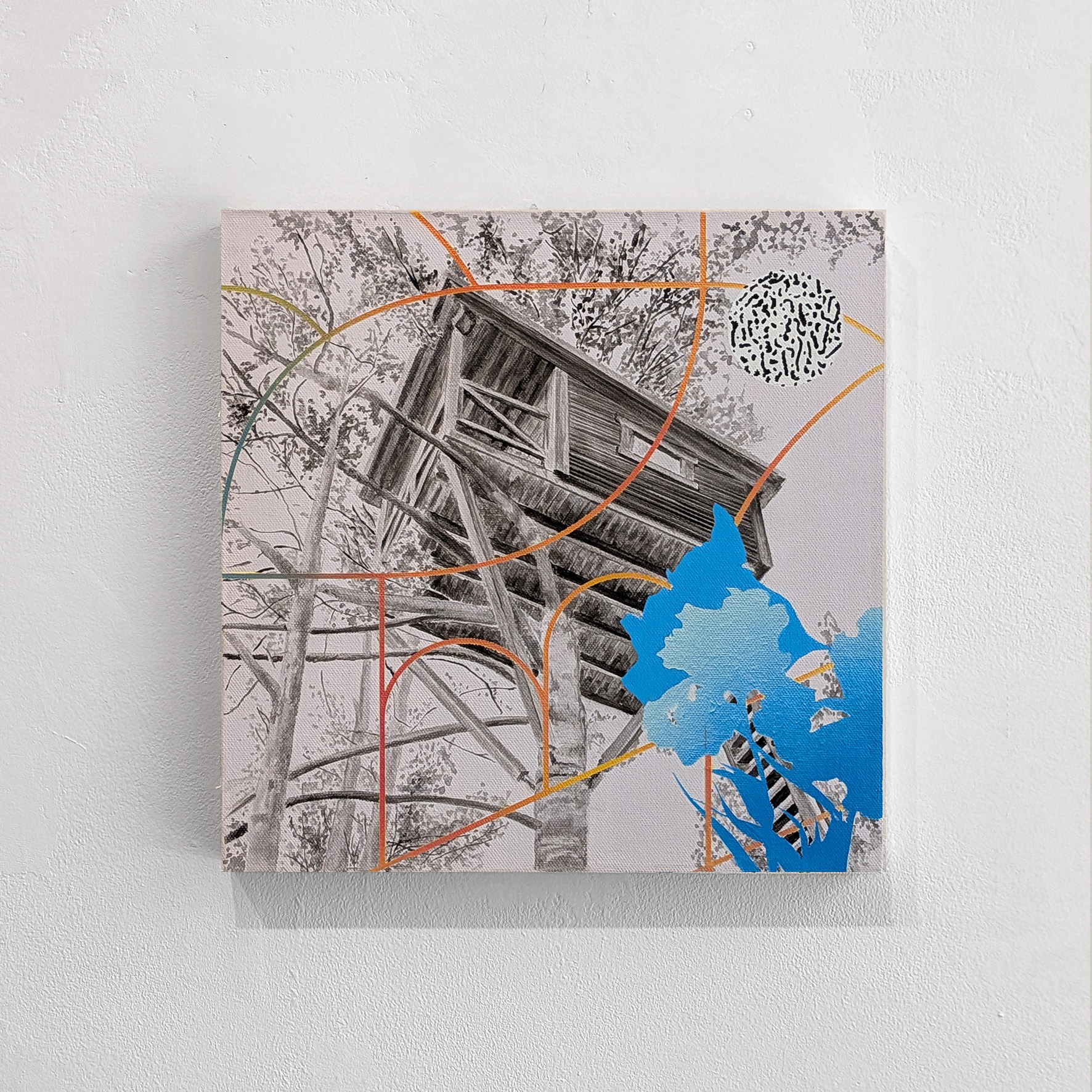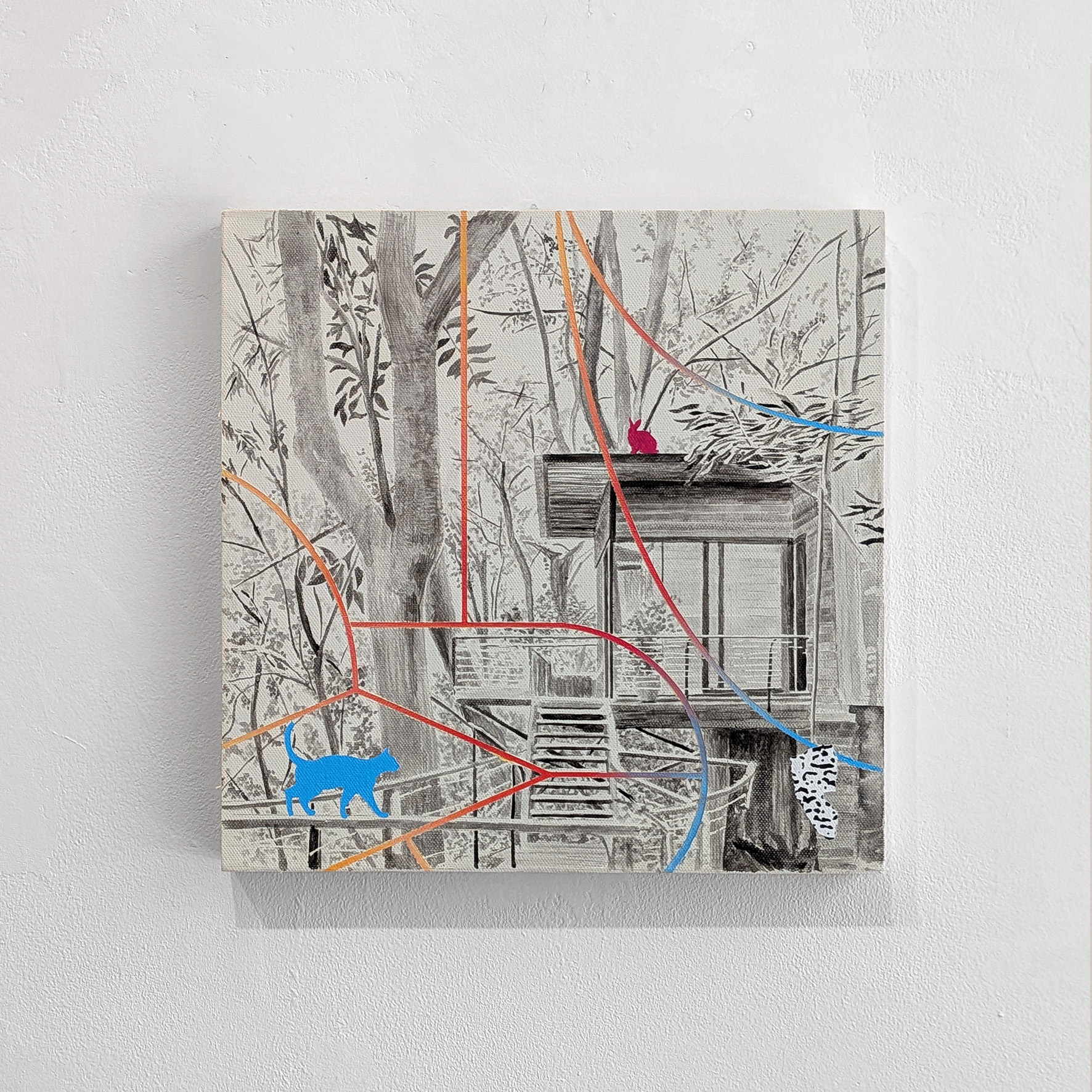 (diferentes aves y mamíferos captados como integrantes reales o como fantasmagorías en un contexto vivo y vibrante), sino que también nos ofrece uno de los principales efectos de la acción humana sobre el entorno: arquitecturas efímeras soportadas en estructuras arbóreas, casas de madera que funcionan como intervenciones en el espacio natural, ejercicios de equilibrio y tensión tan reales como simbólicos.